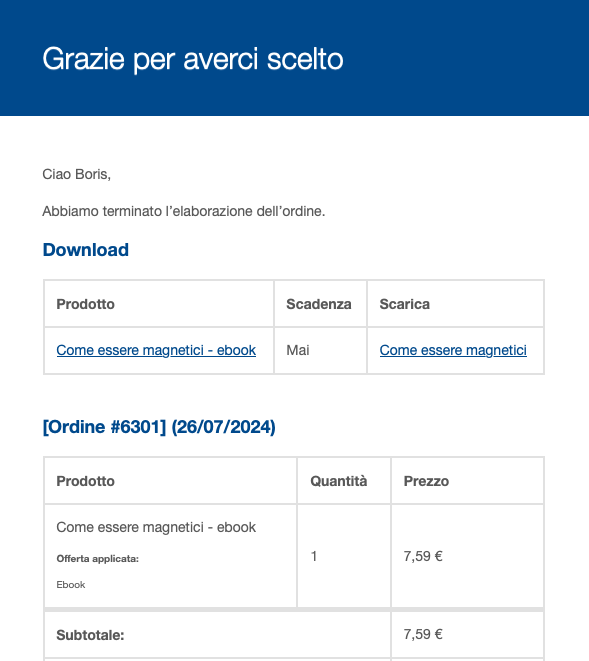 Una volta che avrai effettuato il pagamento e quindi completato l’acquisto di un contenuto digitale (ebook e/o CD, DVD o audiolibro scaricabile), riceverai un avviso nella tua casella email con il link per scaricare il contenuto digitale, vedi esempio: