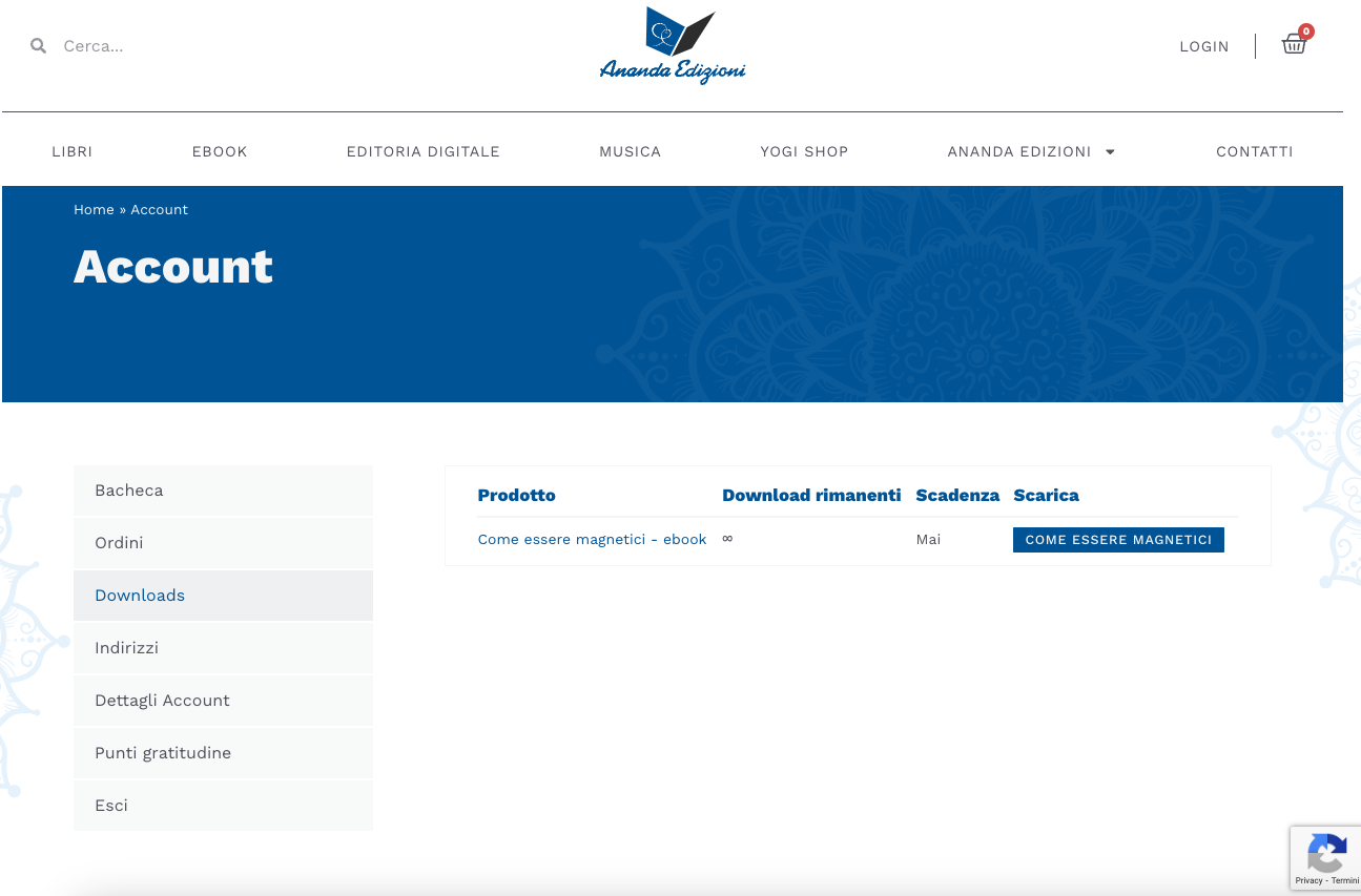 Oppure avrai sempre accesso a tutti i tuoi materiali scaricabili nel tuo account personale su Ananda Edizioni nella sezione “download”, vedi esempio: